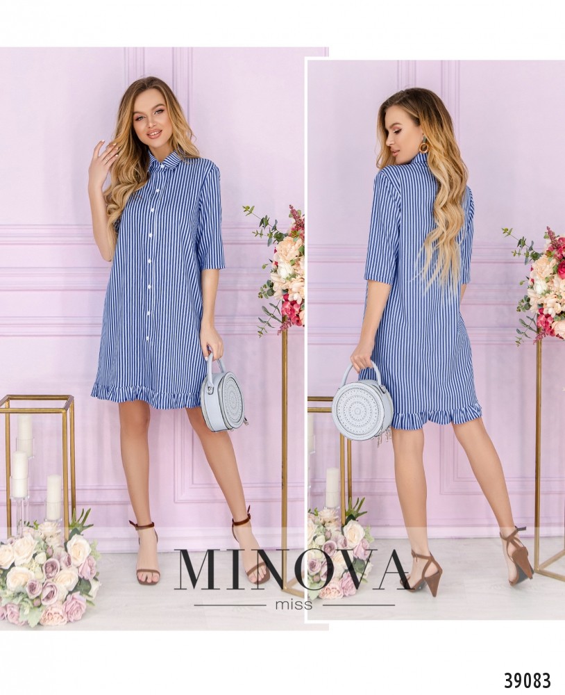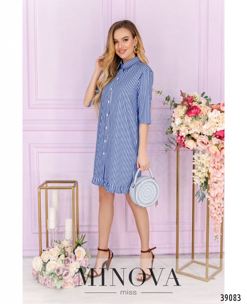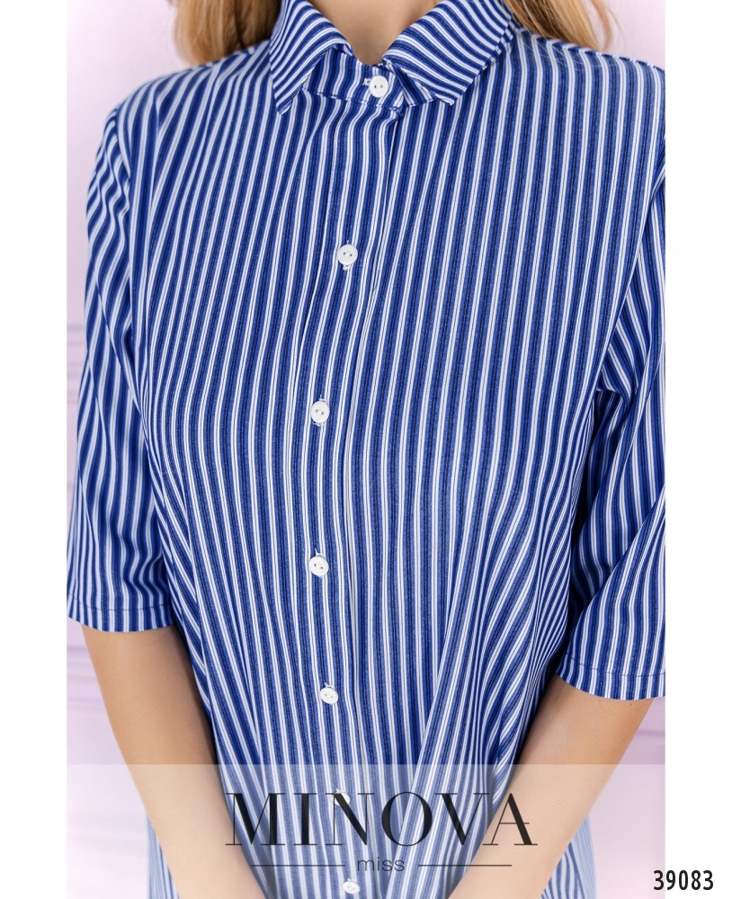 Лёгкое повседневное платье в тонкую полоску, без карманов, застёгивается на пуговицы, расположенные спереди на планке. Воротничок отложной.