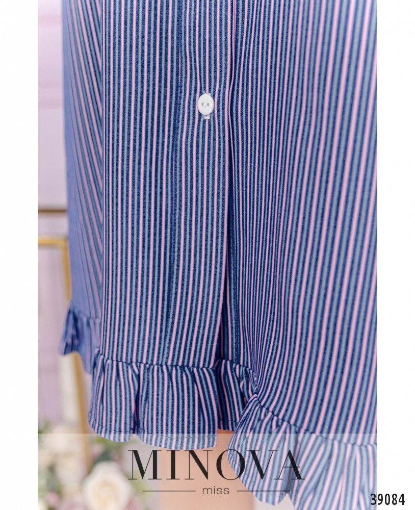 Лёгкое повседневное платье в тонкую полоску, без карманов, застёгивается на пуговицы, расположенные спереди на планке. Воротничок отложной.