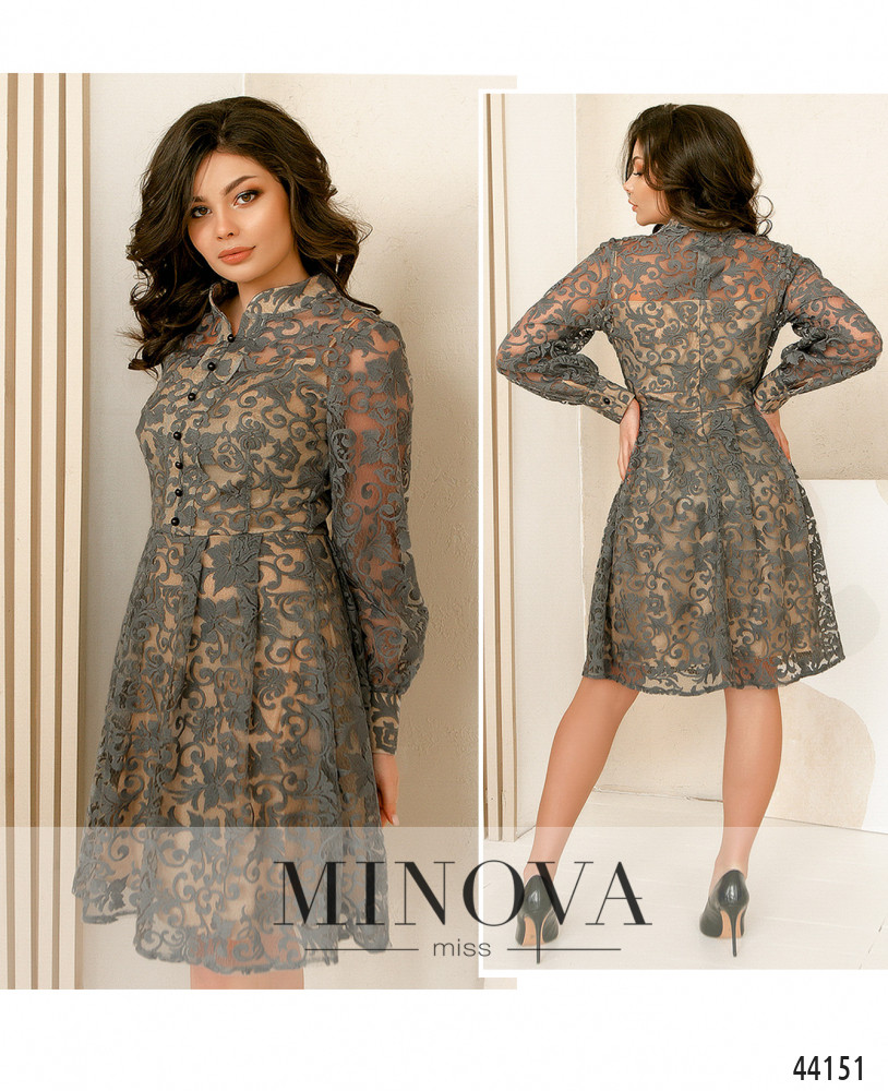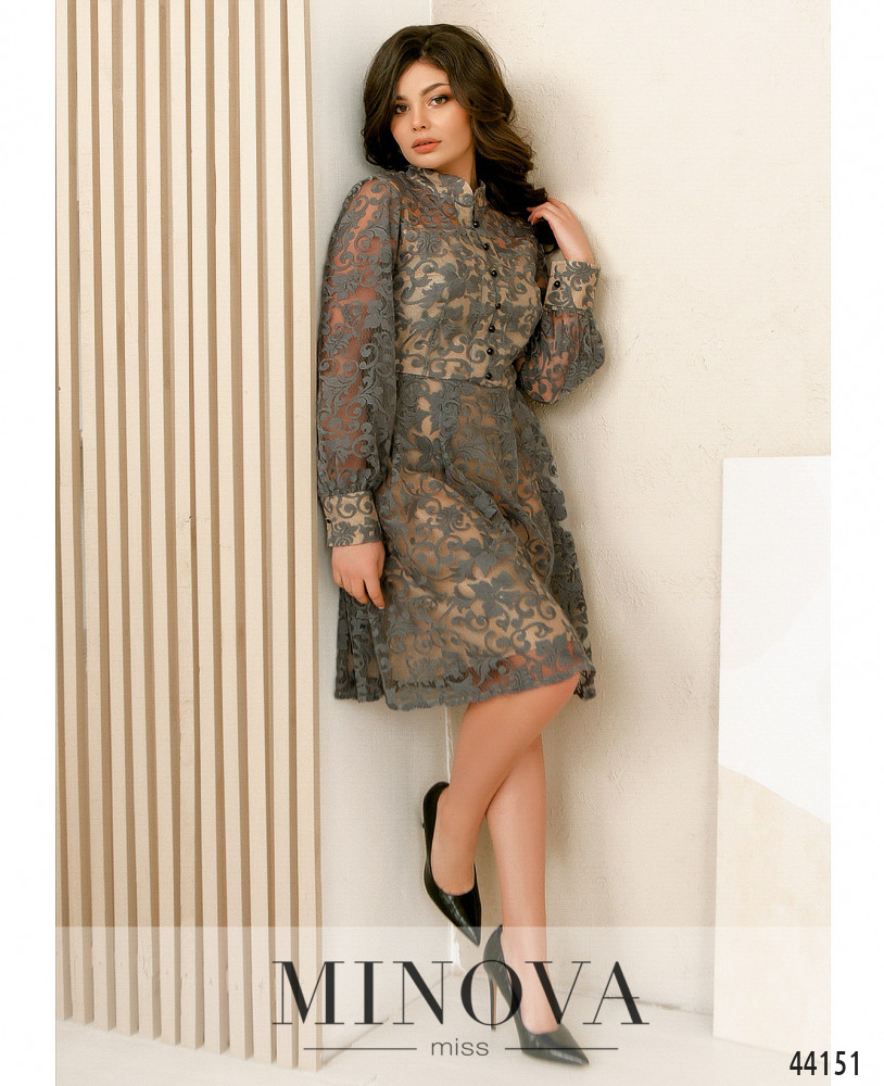 Оригинальное, очень стильное платье с подшитой под полупрозрачным лифом майкой на лямках. Рукава полупрозрачные, манжеты плотные, с маленькими пуговками, такие же декоративные пуговицы на лифе, от воротничка-стоечки до отрезного подола. Подол с мягкой подкладкой. Застёжка - вшитая по спинке молния. На талии на верхней ткани продольные вытачки, на майке на груди - поперечные. Карманов нет.