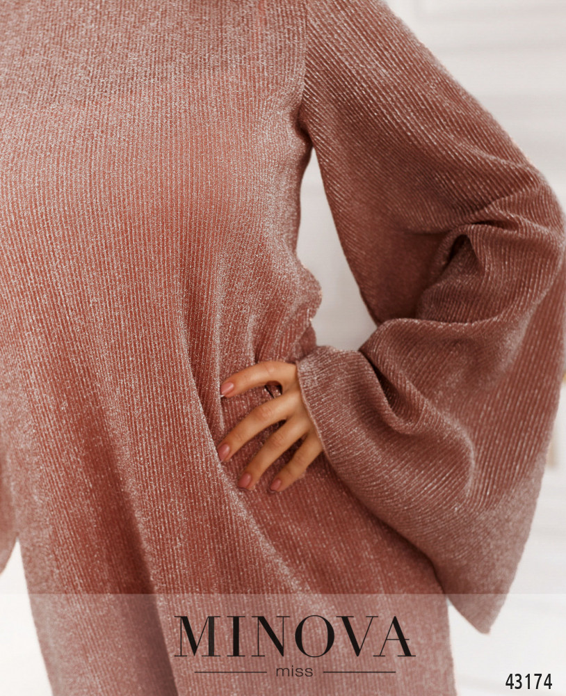 Элегантное двойное платье без карманов. Нижнее по стилю напоминает комбинацию на тонких лямках, без застёжек. Верхнее - с рукавами фасона "колокол", застёгивается на молнию, вшитую по спинке. Ткань с люрексом.