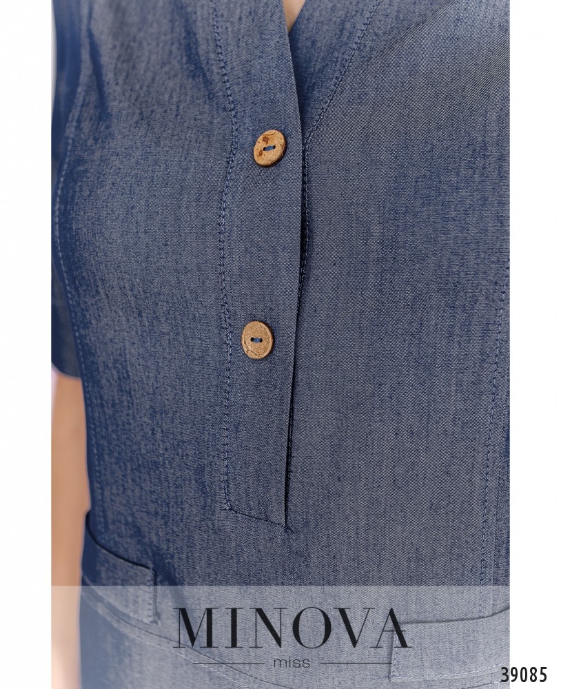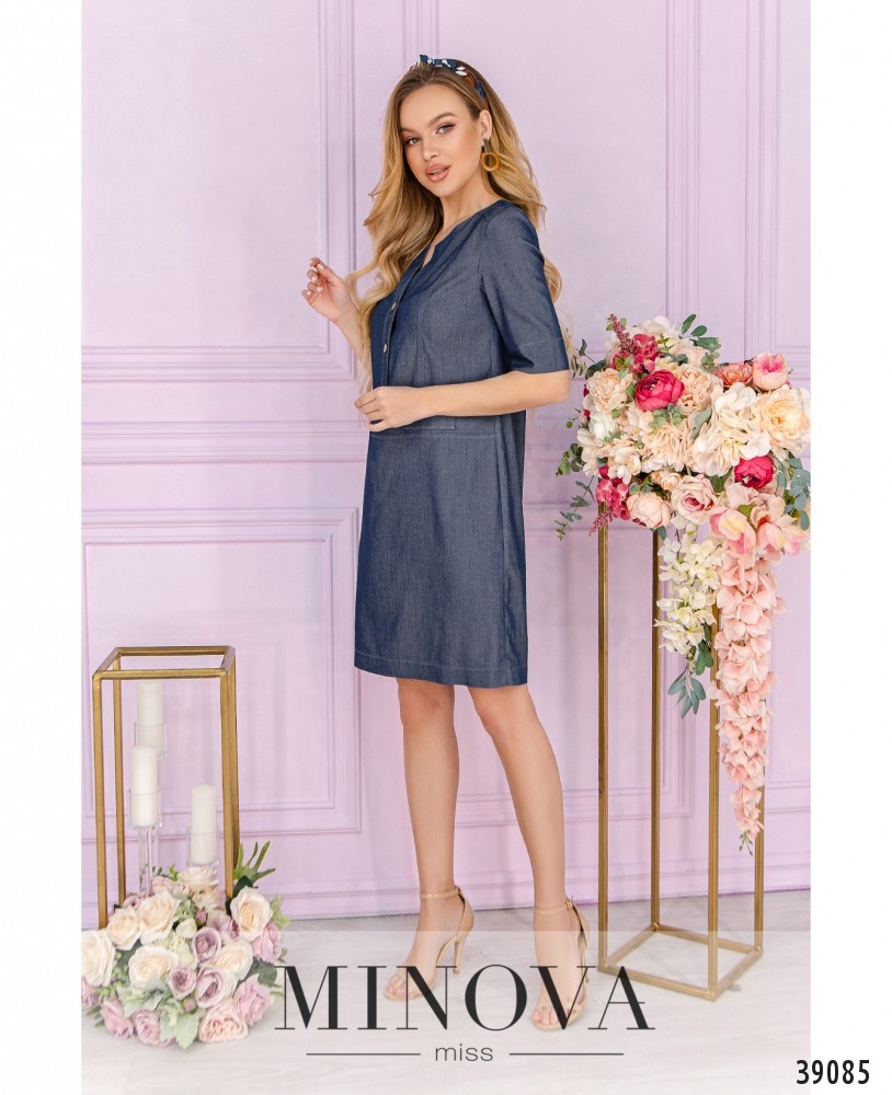 Удобное и стильное повседневное платье с широким полукруглым вырезом горловины и рядом пуговиц спереди на планке, до талии. Спереди - декоративные клапаны на бёдрах, карманов нет. Рукава без манжет. Силуэт приталенный.
