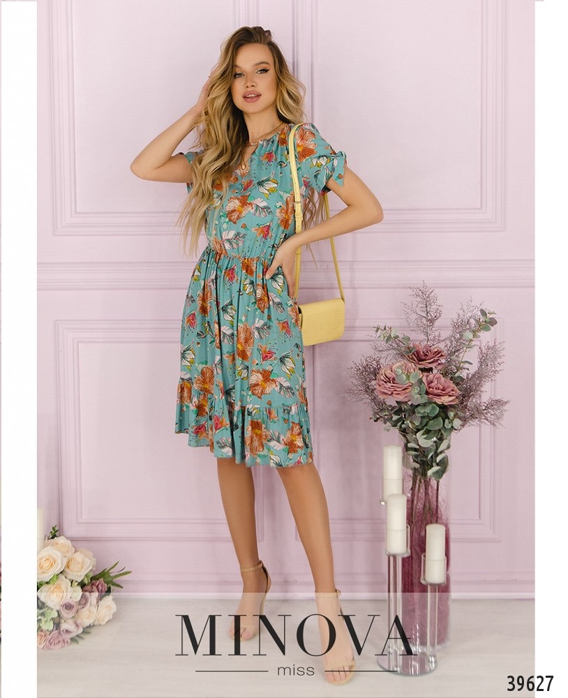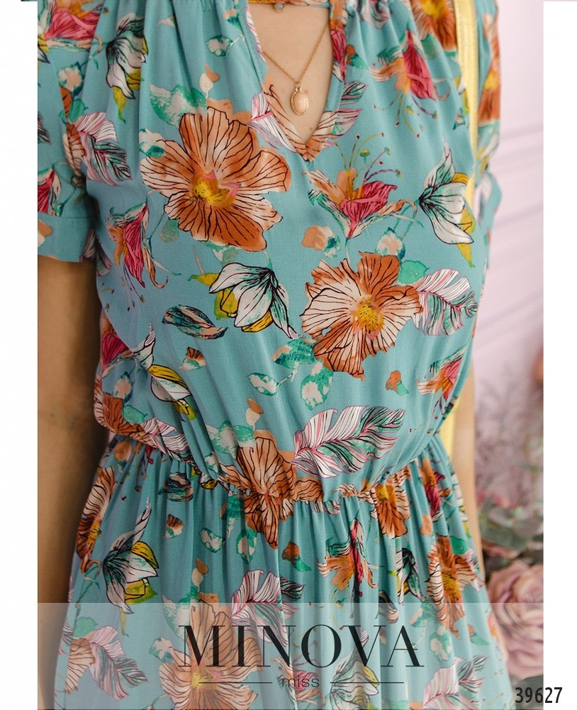 Стильное платье с цветочным принтом и завязками на V-образных вырезах спереди и по спинке. Рукава короткие, с манжетами, которые можно завязать на бант. Без застёжек и карманов. По низу подола подшиты оборки. Подол подшит к верху, в пояс вшита резинка.