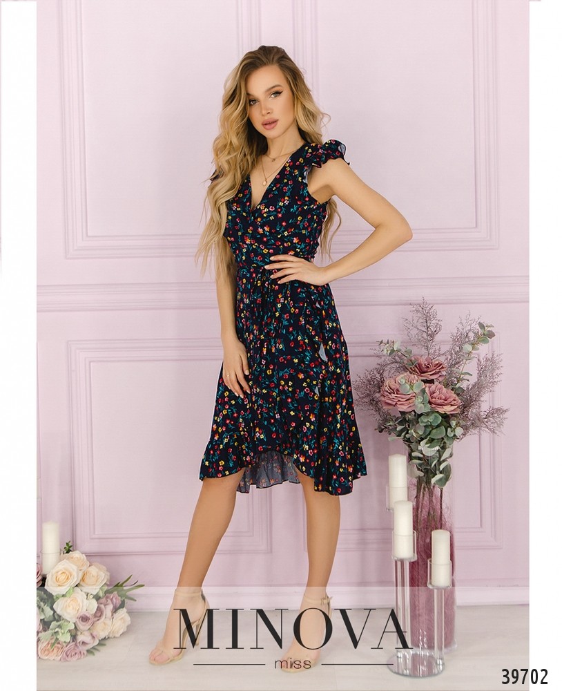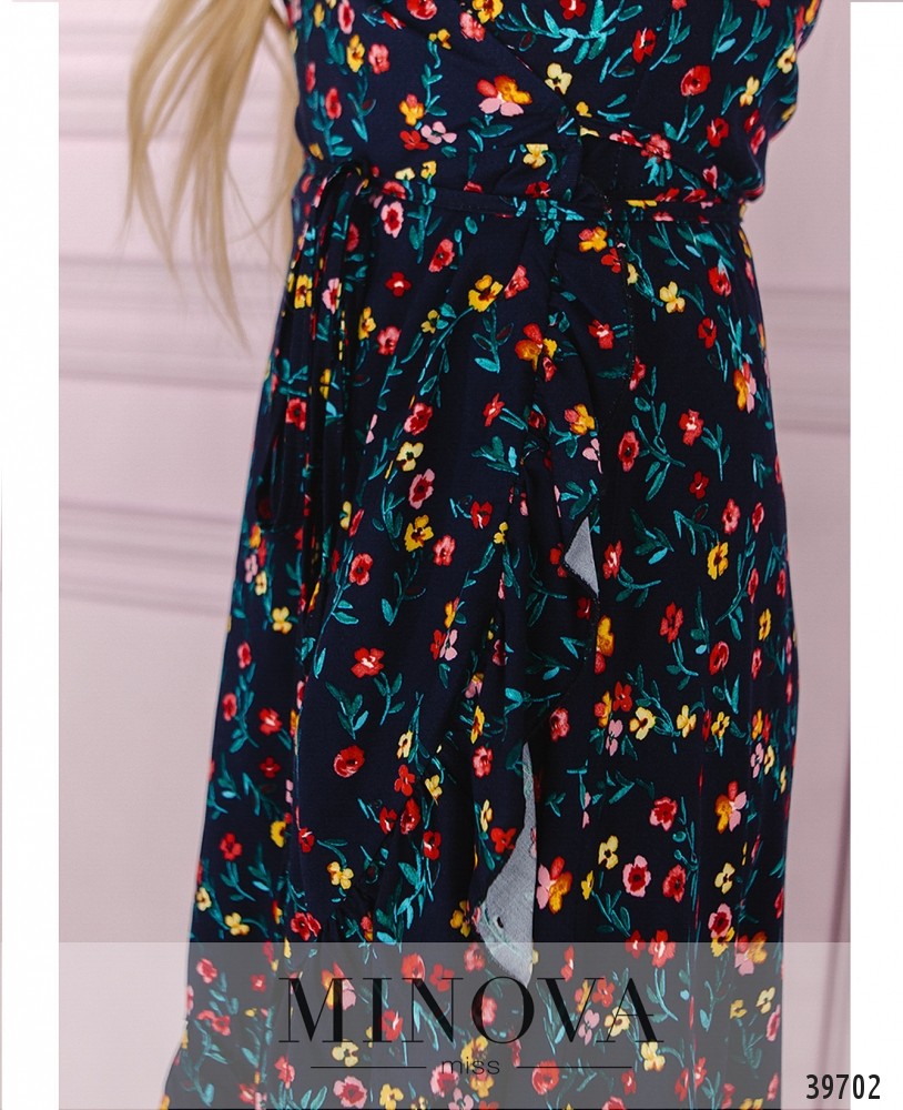 Лёгкое и яркое платье с крупным цветочным принтом, завязывается на запАх через прорезь на поясе сбоку, рукава - небольшие крылышки с оборками. Без карманов и застёжек.