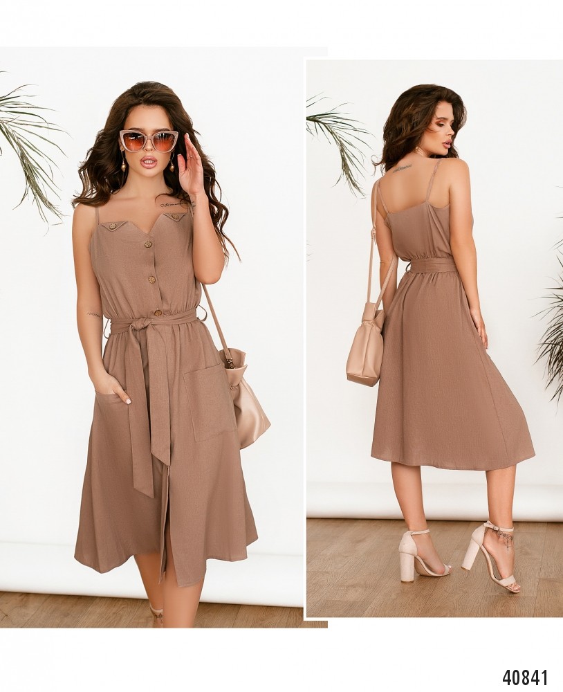 Лёгкий романтичный сарафан с тонкими бретельками (не регулируются). В пояс вшита резинка. По бокам - накладные карманы. Застёгивается на ряд пуговиц спереди на планке. В комплекте - пояс, по бокам две шлейки для него. На груди вытачки.