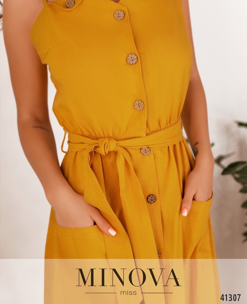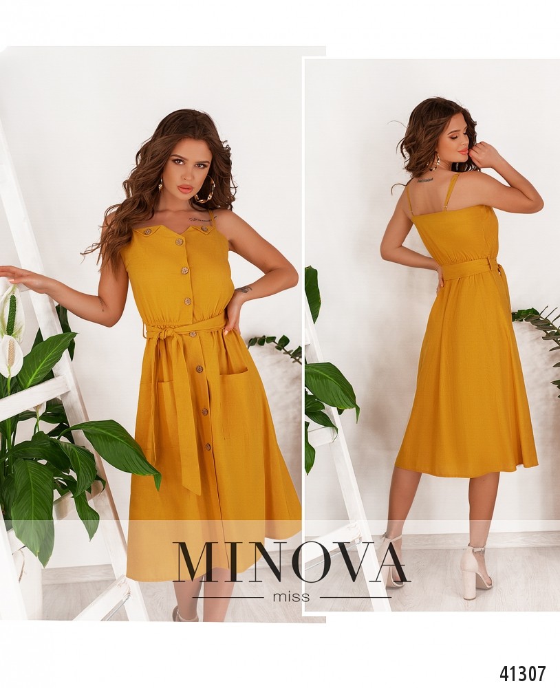 Нежное лёгкое платье с тонкими регулируемыми бретельками. Застёгивается на ряд пуговиц спереди на планке. По бокам спереди - накладные карманы. В талию вшита резинка, в наличии пояс в тон.