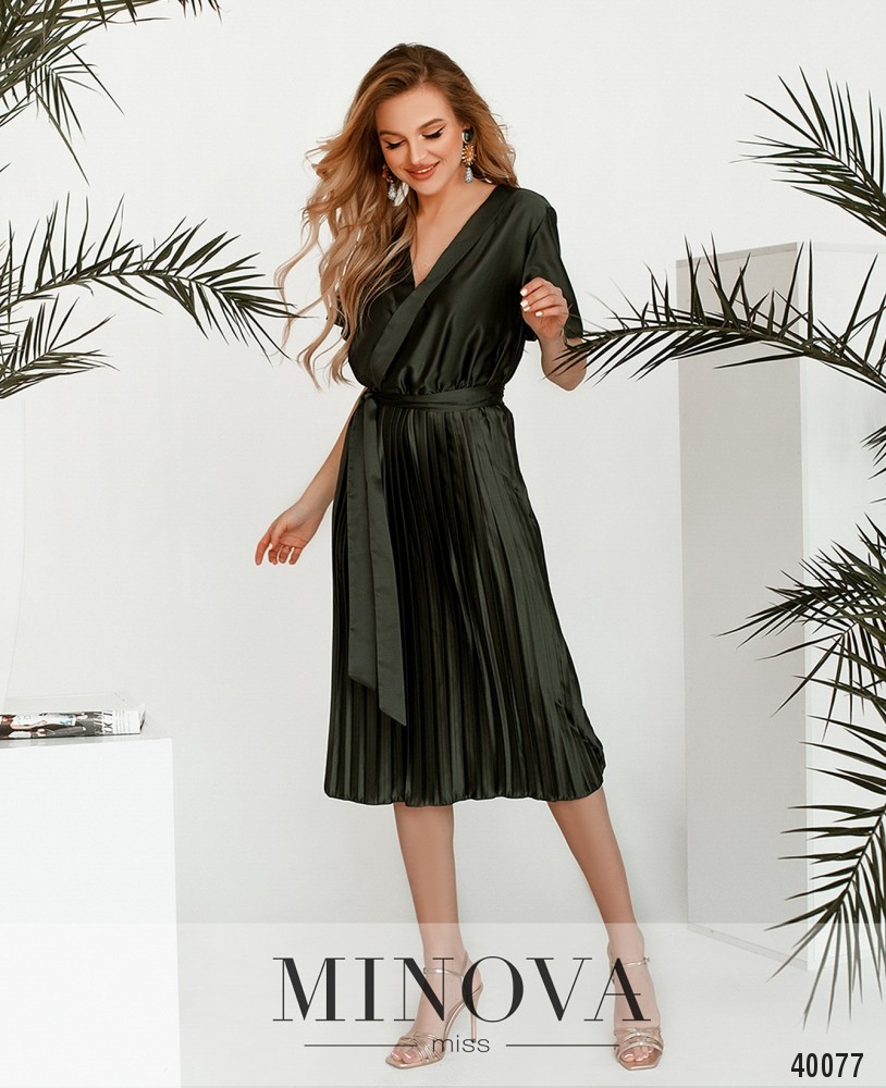 Элегантное платье со свободными рукавами и глубоким запАхом на лифе. В талию вшита резинка, в наличии пояс в тон платью. Подол плиссированный. Карманов и застёжек нет.