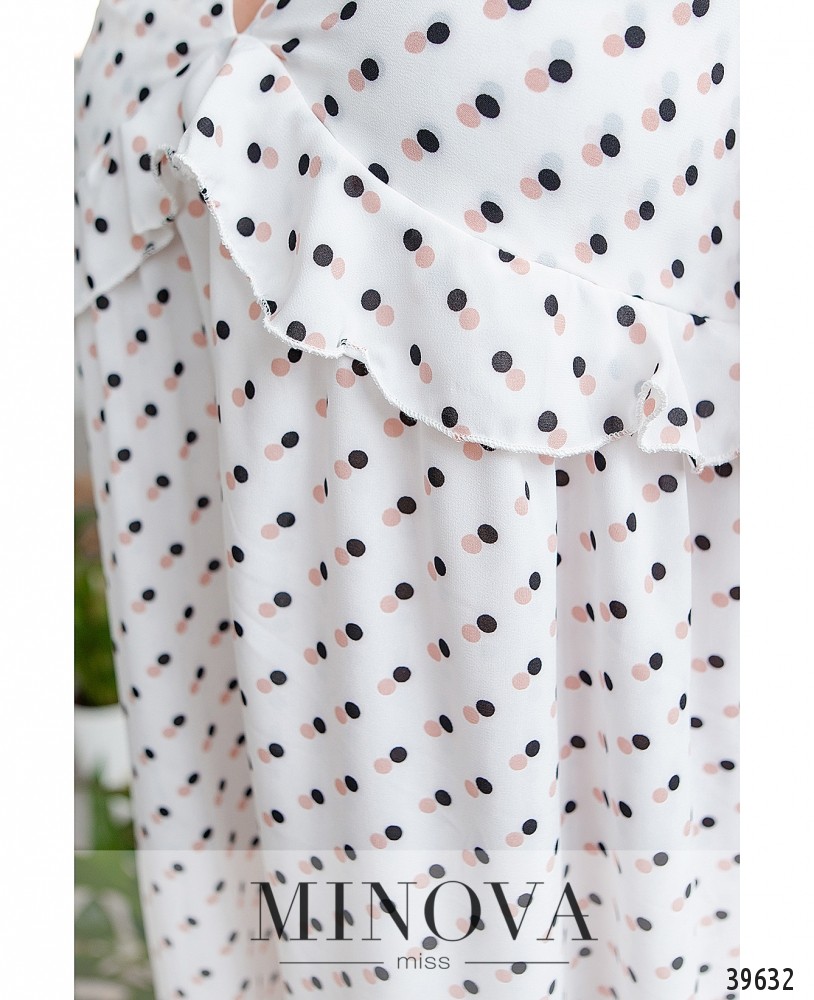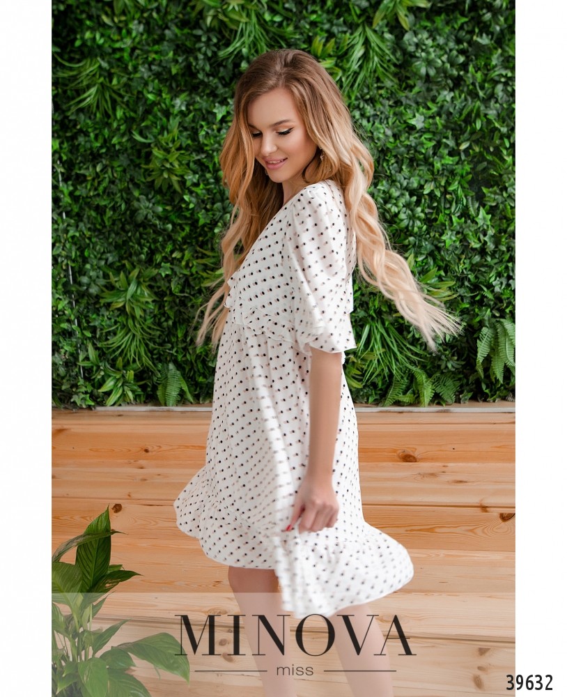 Милое платье в горошек с оборками на талии и глубоким V-образным декольте. Рукава-крылышки, без манжет. К подолу подшиты оборки, подол расклешённый. Карманов и застёжек нет.