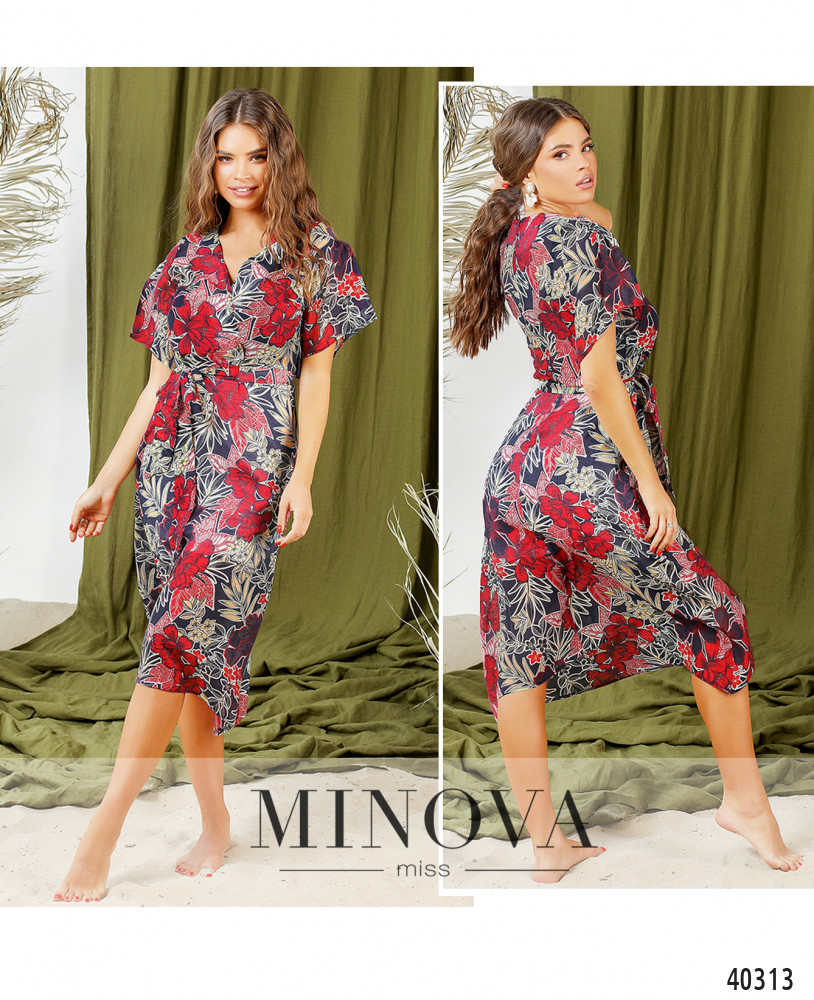 Стильное платье с неглубоким V-образным вырезом, подшитым на запАх. Подол подшит к верху, на талии подшит длинный пояс, который охватывает талию. Карманов нет. Застёгивается на змейку, вшитую по спинке. Рукава расклешённые, короткие. На груди вытачки.