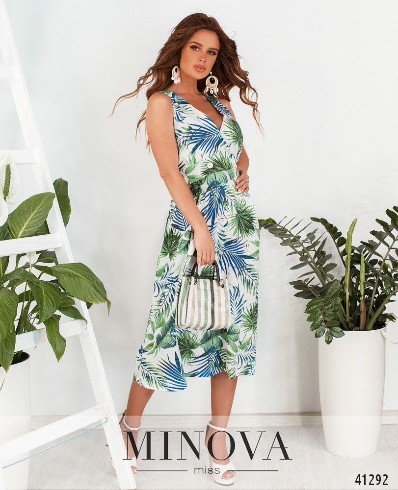 Позитивное и нарядное летнее платье "двубортного" фасона с двумя пуговицами на талии. Верх подшит на запАх. Застёжка - молния, вшитая по спинке. По бокам - врезные карманы. Ткань от пояса присобрана вытачками.