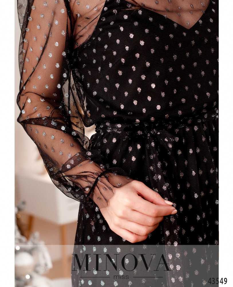 Стильное двойное платье, нижняя часть напоминает майку с тонкими лямками, без застёжек и карманов. На груди вытачки. Верхняя накидка полупрозрачная, с блёстками, без карманов, застёжка - пуговка сзади под шеей. Снизу украшена оборками. Рукава с оборками и резинкой на манжетах.