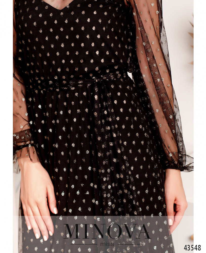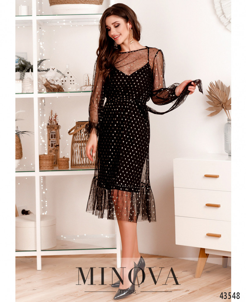 Стильное двойное платье, нижняя часть напоминает майку с тонкими лямками, без застёжек и карманов. На груди вытачки. Верхняя накидка полупрозрачная, с блёстками, без карманов, застёжка - пуговка сзади под шеей. Снизу украшена оборками. Рукава с оборками и резинкой на манжетах.