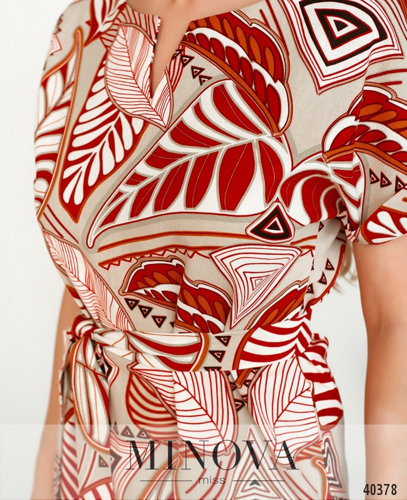 Яркое платье без застёжек и карманов, с поясом, рукава с отворотами, вырез горловины неглубокий, V-образный.