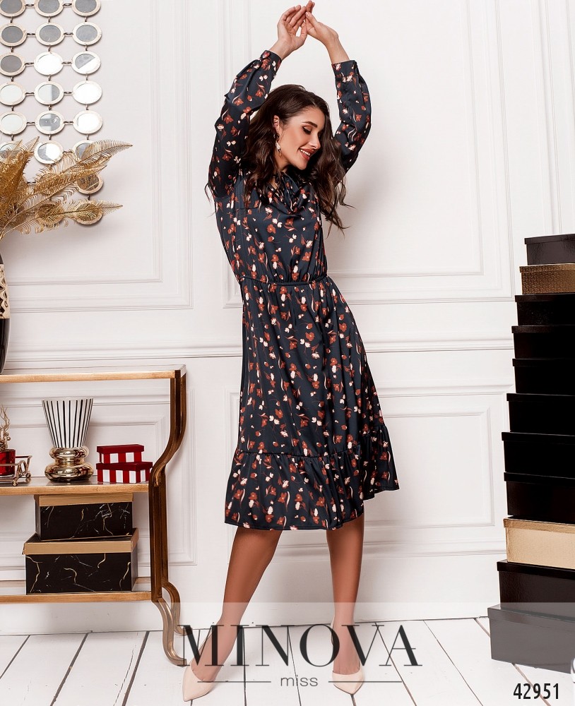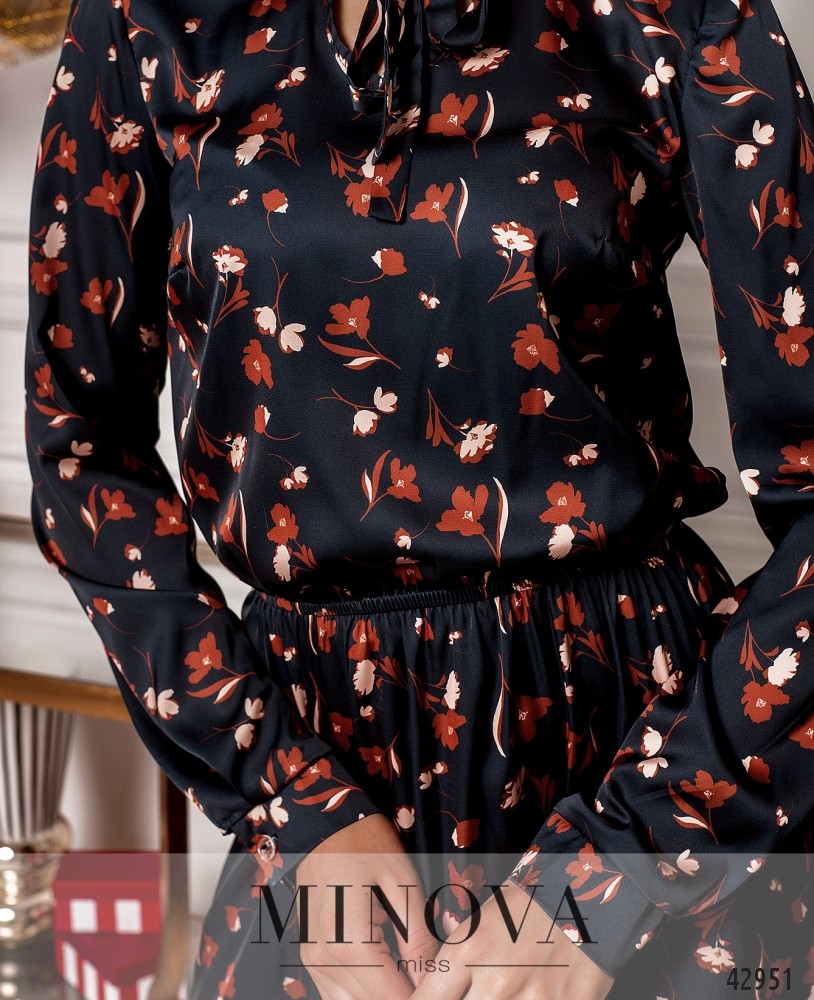Романтичное платье с завязками на горловине, рукава с манжетами, на манжетах по одной пуговице. Подол с оборками. В пояс вшита резинка, карманов нет.