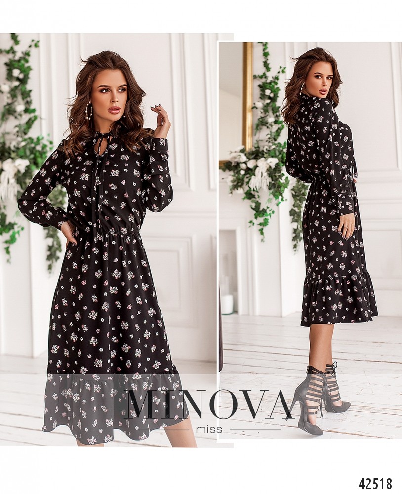 Женственное платье с цветочным принтом. Застёжек и карманов нет, на подоле - оборки, на шее спереди - завязки. Рукава с манжетами, на манжетах по одной пуговице. Подол подшит к верху и расклешён.