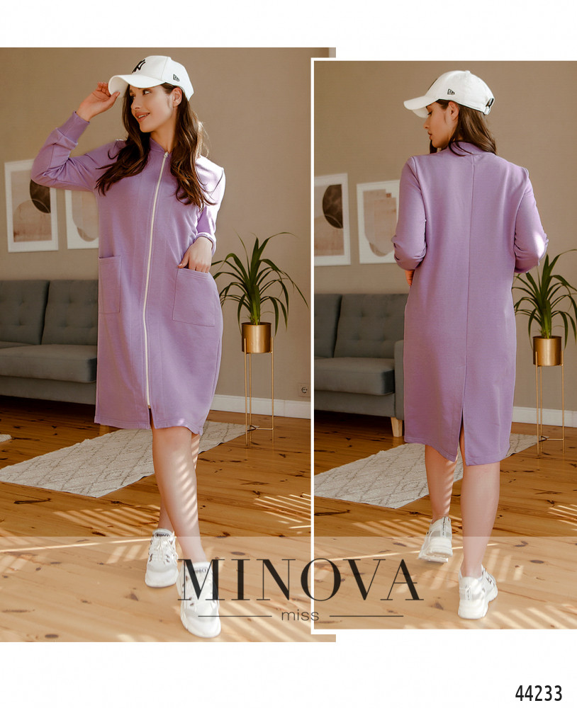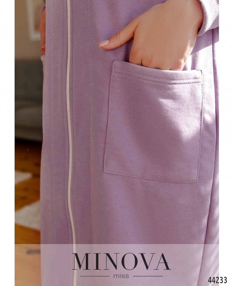 Комфортное платье с мягким манжетом на горловине и на рукавах, спереди накладные карманы, застёгивается на сквозную змейку спереди по центру, сзади на подоле шлица. Без подкладки.