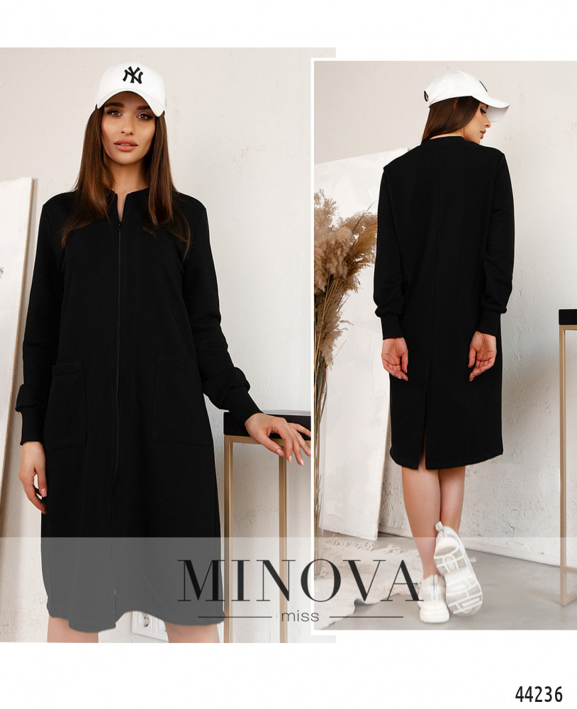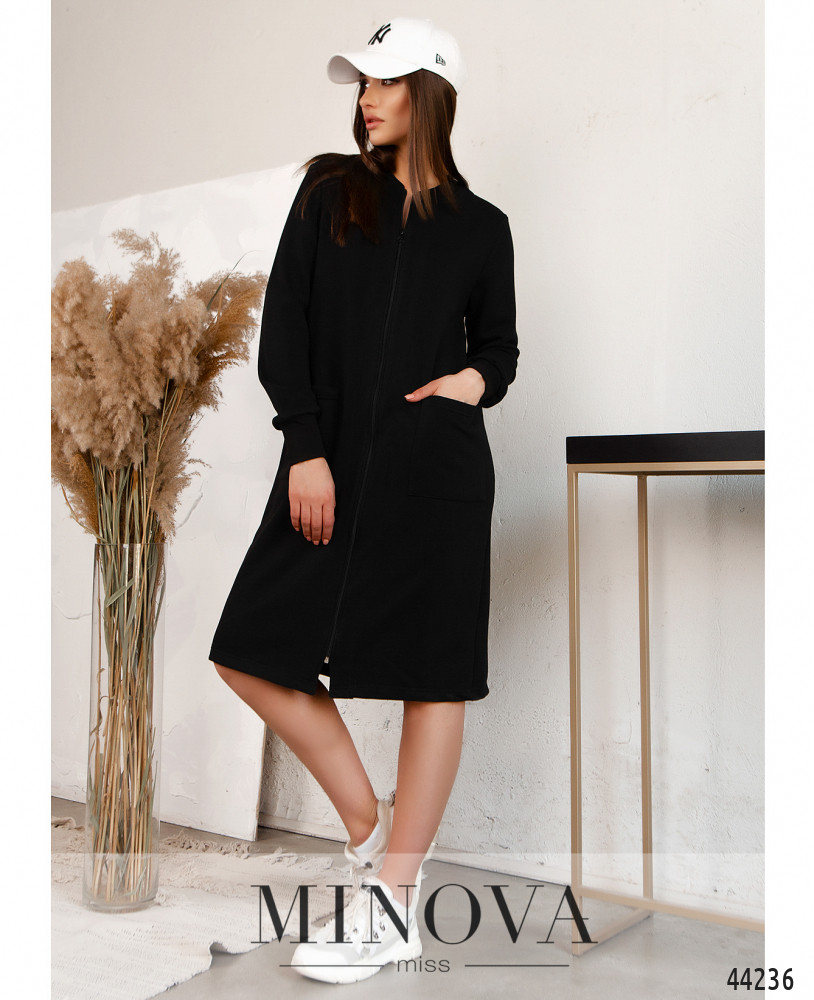 Комфортное платье с мягким манжетом на горловине и на рукавах, спереди накладные карманы, застёгивается на сквозную змейку спереди по центру, сзади на подоле шлица. Без подкладки.