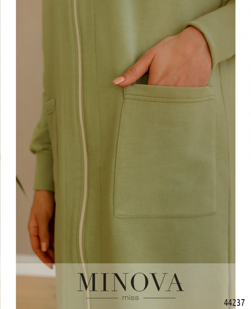 Комфортное платье с мягким манжетом на горловине и на рукавах, спереди накладные карманы, застёгивается на сквозную змейку спереди по центру, сзади на подоле шлица. Без подкладки.