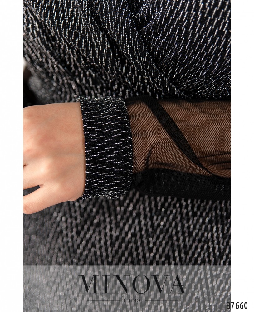 Нарядное вечернее приталенное платье с люрексом, рукава из сеточки, манжеты также украшены люрексом. На плечах – вставка сеточки. Изнутри – мягкая подкладка. Карманов нет, застёжка – вшитая по спинке молния. Лиф подшит на запАх.