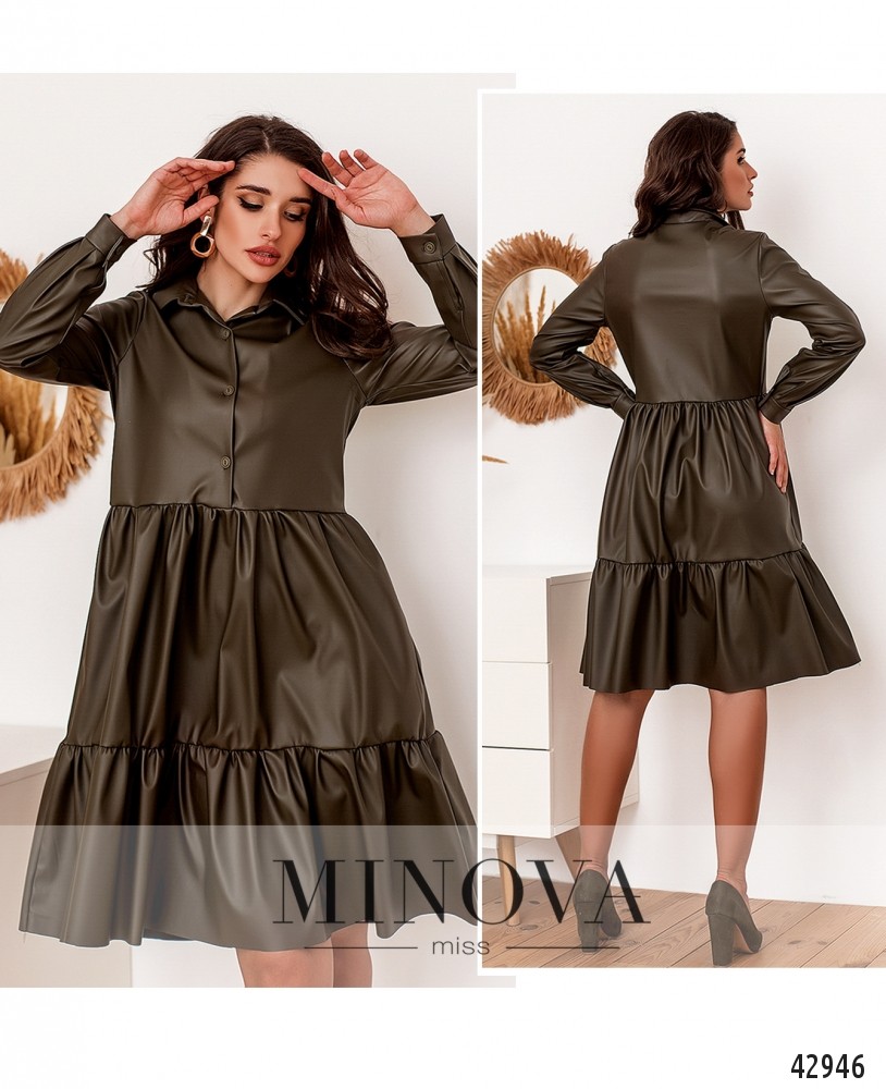 Оригинальное платье с расклешённым подолом, украшенным оборками. Воротничок отложной, застёгивается на ряд пуговиц спереди на планке до талии. Рукава с манжетами, на манжетах по одной пуговице. По бокам - врезные карманы. Ткань изнутри гладкая.