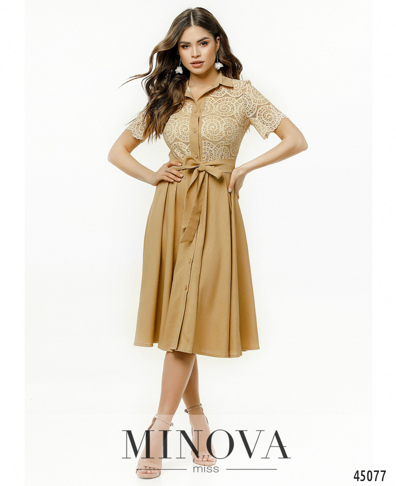 Стильное привлекательное платье с воротником и ажурным кружевным лифом с подкладкой в области груди. Посадку по фигуре обеспечивают вытачки под грудью и на спинке. Впереди пуговицы на планке, расстегивающиеся по всей длине. Спинка однотонная без кружевных вставок.