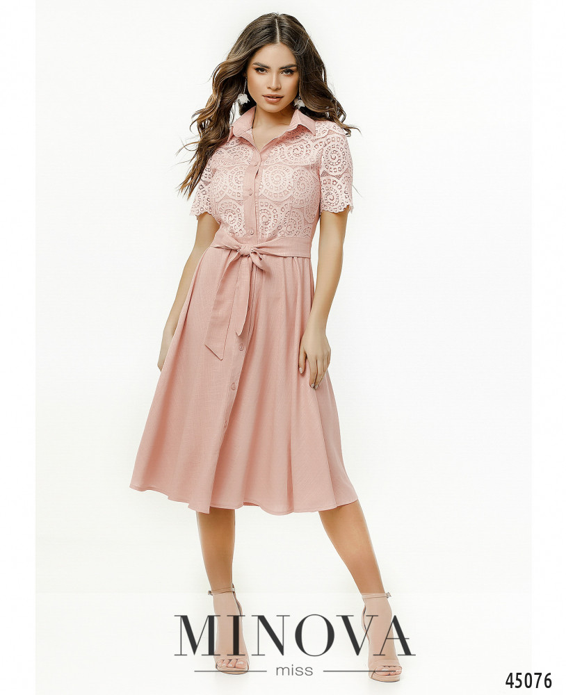 Стильное привлекательное платье с воротником и ажурным кружевным лифом с подкладкой в области груди. Посадку по фигуре обеспечивают вытачки под грудью и на спинке. Впереди пуговицы на планке, расстегивающиеся по всей длине. Спинка однотонная без кружевных вставок.