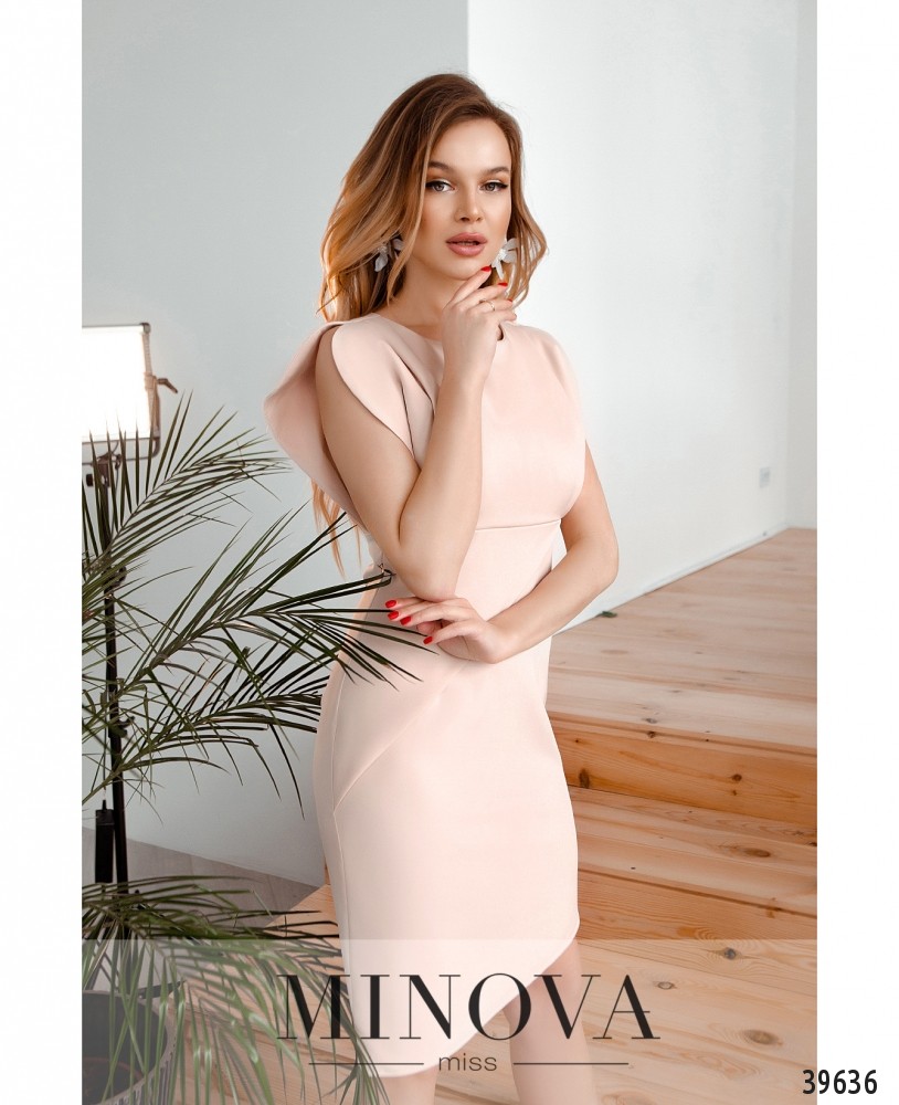 Очаровательное, стильное платье-футляр с оригинальным кроем рукавов: плечи прикрыты, верх скошен полукругом, между спинкой и передней частью - вставки. Подол подшит, декорирован запАхом, асимметричный. Карманов нет, застёжка - вшитая по спинке молния. Силуэт приталенный благодаря скульптурирующим вытачкам на спинке и на лифе.