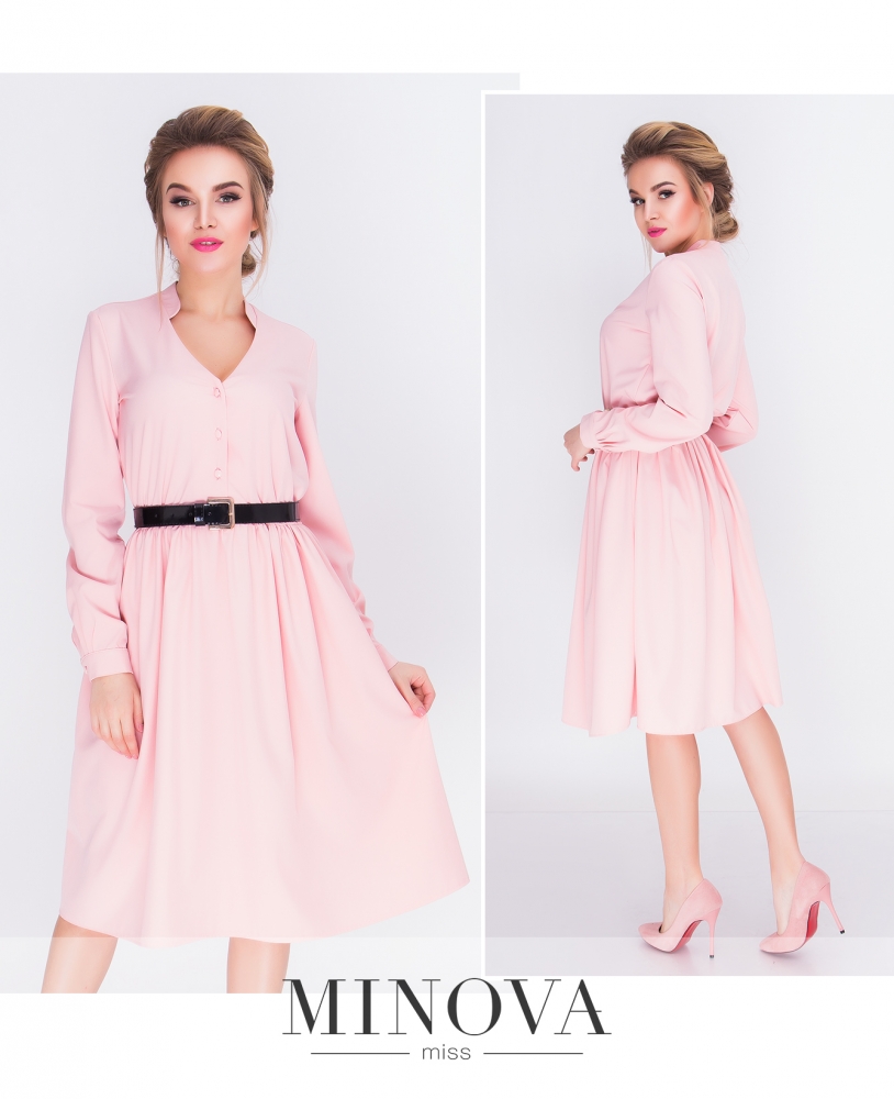 Летящее приталенное платье на резинке с расклешенной юбкой, V-образным вырезом на пуговицах и воротником-стойкой. Талия подчеркнута черным лаковым ремешком на пряжке. Ремешок входит в комплект. Рукава-фонарики застегиваются на пуговицы.Длина платья закрывает колени.