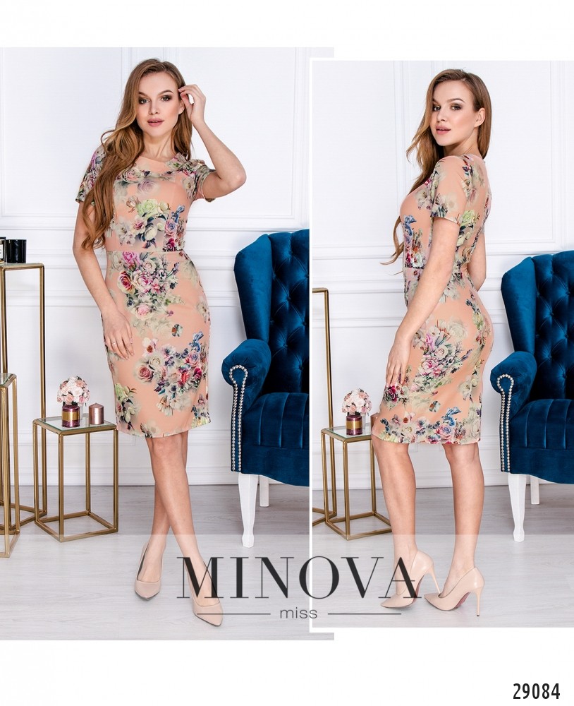 Платье – футляр с короткими рукавами в нежный цветочный рисунок. Платье прекрасно подчеркивает женственность силуэта засчет отрезной талии и вытачек. На спинке платье застегивается на скрытую молнию и дополнено разрезом по линии шага.