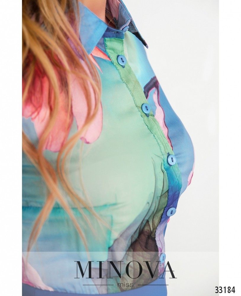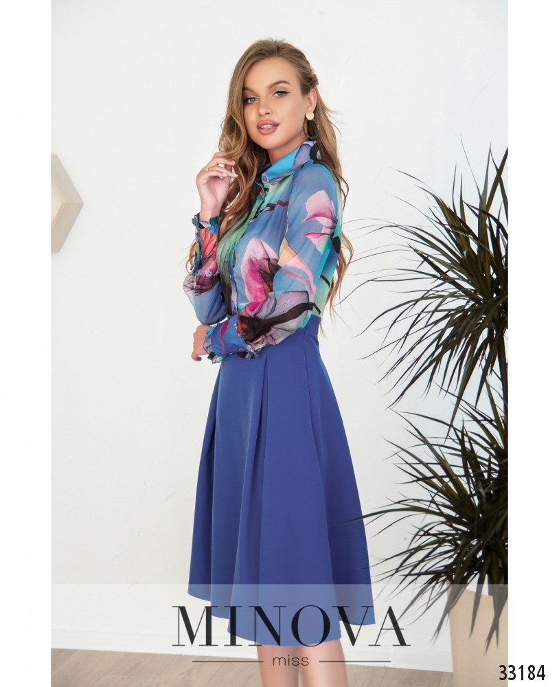 Не платья, а конфетки! Minova просто радует глаз и душу такими нарядными моделями платьев. Наряд двухчастный, как будто блуза с юбкой. Юбка однотонная, с крупным плиссе, из плотной ткани, расклешена. Блуза из лёгкой ткани, напоминающей атлас, с цветочным акварельным принтом, рубашечного типа. Отложной воротничок, ряд рабочих пуговиц до талии рукава полной длины, на манжетах две пуговицы, отороченные мелкими рюшами. Застёжка располагается сбоку – от левой подмышки до бедра вшита потайная змейка. Карманов нет. Чудесный наряд для романтичного свидания или дружеских встреч. Носить рекомендуется с классической обувью на каблуке или балетками.
