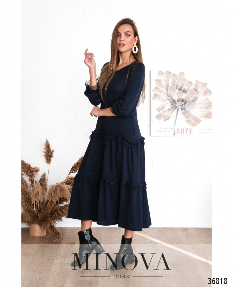 Очень нежное и женственное платье из новой коллекции Minova имеет все шансы стать вашим фаворитом – ведь оно практически универсально: и на прогулку, и на свидание, и для дома. Платье А-силуэта, с оборками на подоле. Рукава полной длины, с небольшими волнистыми манжетами. Манжеты и оборки подола украшены лёгкой прозрачной сеточкой, сеточка декорирована ромбиками из бархатистой ткани. Платье без застёжек и карманов, с полукруглым широким вырезом горловины. Вы можете сочетать такой наряд с любой подходящей обувью, а благодаря свободному крою оно будет прекрасно смотреться на любом типе фигуры.