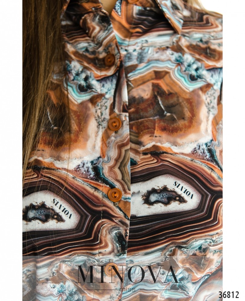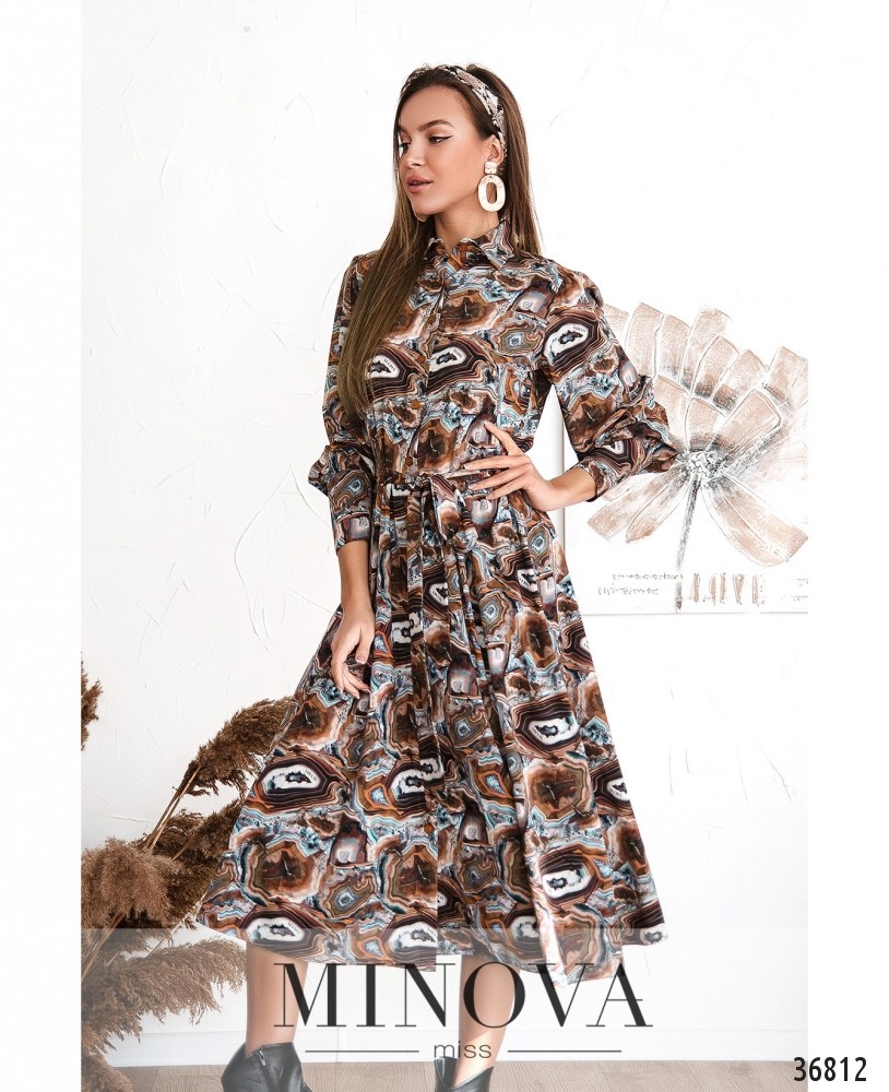 Необычное, оригинальное платье для создания праздничного настроения даже в будний день – уже в новом каталоге Minova! Платье А-силуэта с ярким принтом, напоминающим полудрагоценные камни в разрезе. Воротничок отложной, застёжка – полный ряд пуговиц от воротничка до подола. Карманы отсутствуют. Рукава полной длины, с мягкими длинными манжетами, которые застёгиваются на две пуговицы. В комплекте пояс, позволяющий подчеркнуть приталенность силуэта. Прекрасный выбор для повседневного наряда, дополните его обувью на каблуке, учитывая длину миди.