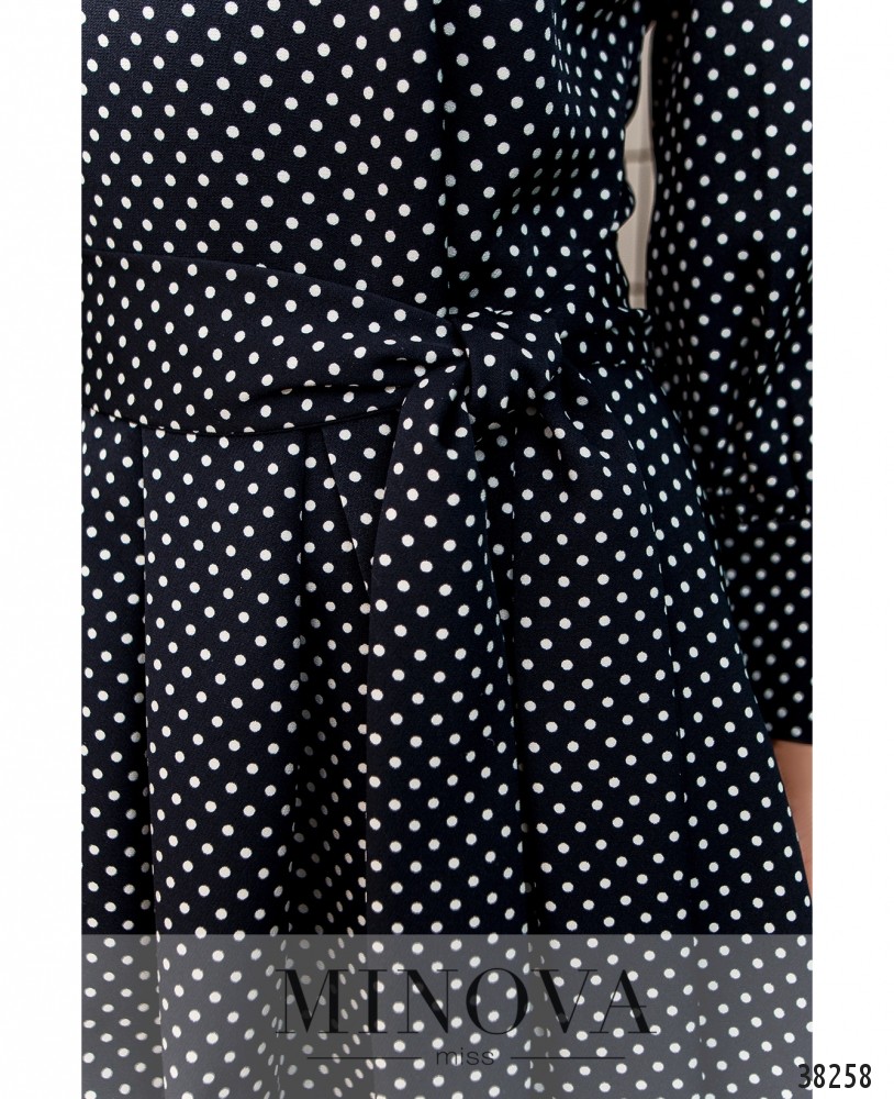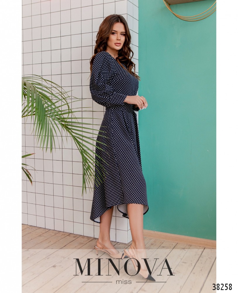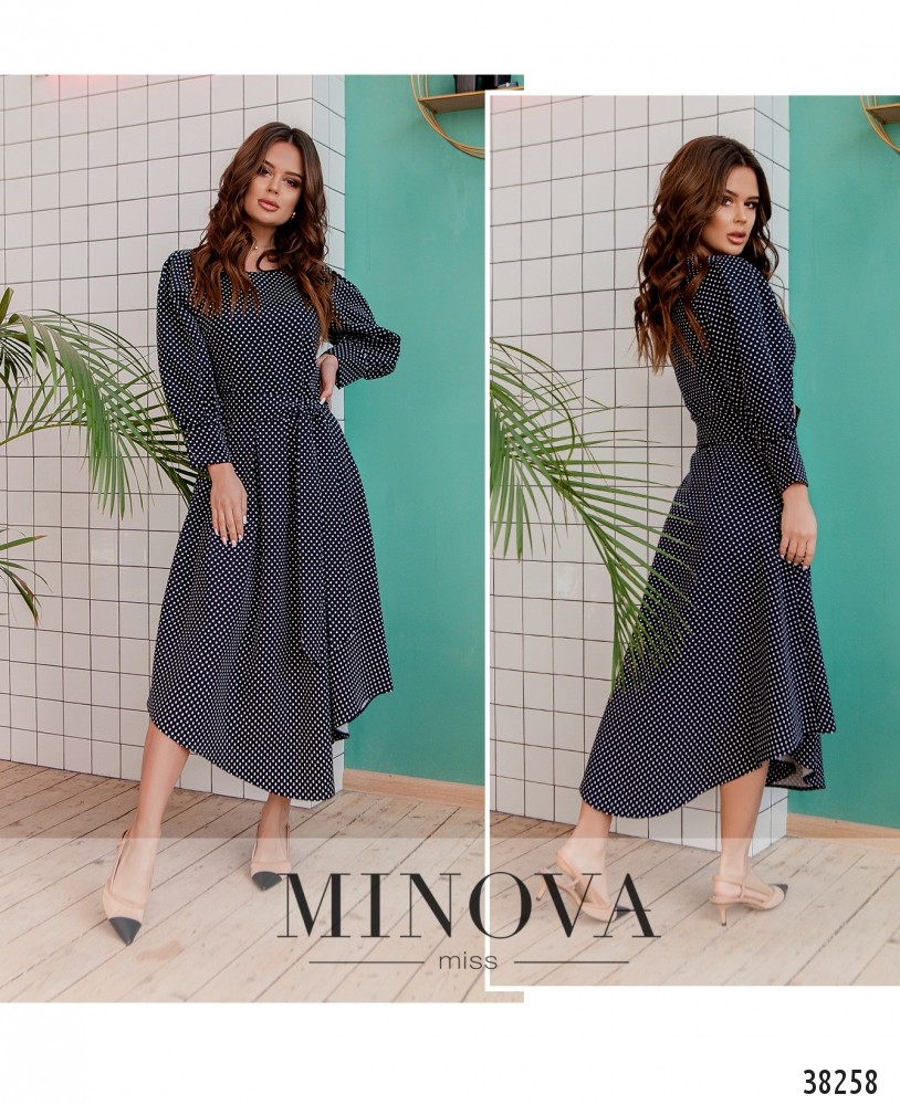 Привлекательное стильное платье с асимметричным подолом, присобранным на талии с помощью декоративных складок, по бокам подол скруглён, подшит к верху. Вырез горловины полукруглый, рукава с мягкими манжетами без пуговиц, на груди вытачки. В комплекте – пояс в тон. Застёжка – потайная молния, вшитая слева.
