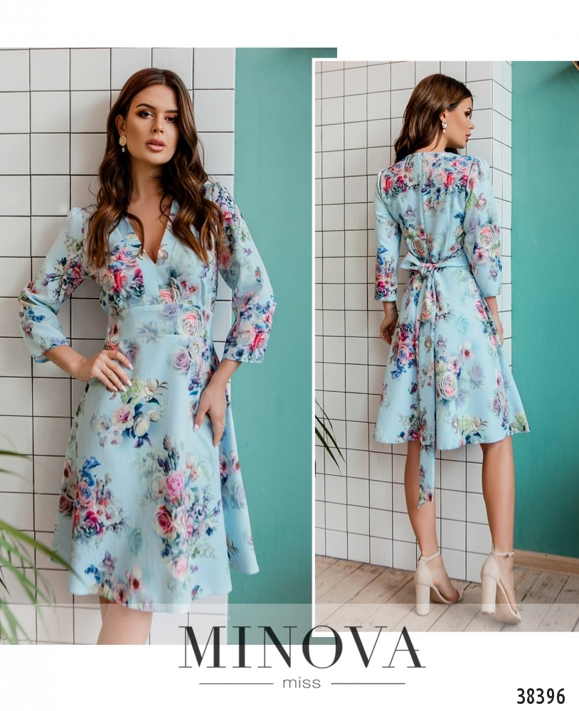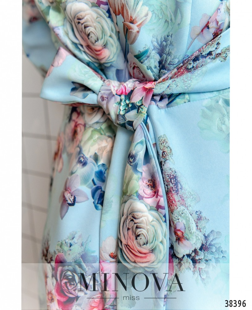 Привлекательное и очень нарядное платье с подшитым поясом, который можно завязать на спине или спереди. Подол расклешён, вырез горловины V-образный. Застёгивается на вшитую по спинке молнию, рукава без манжет. Карманов нет.