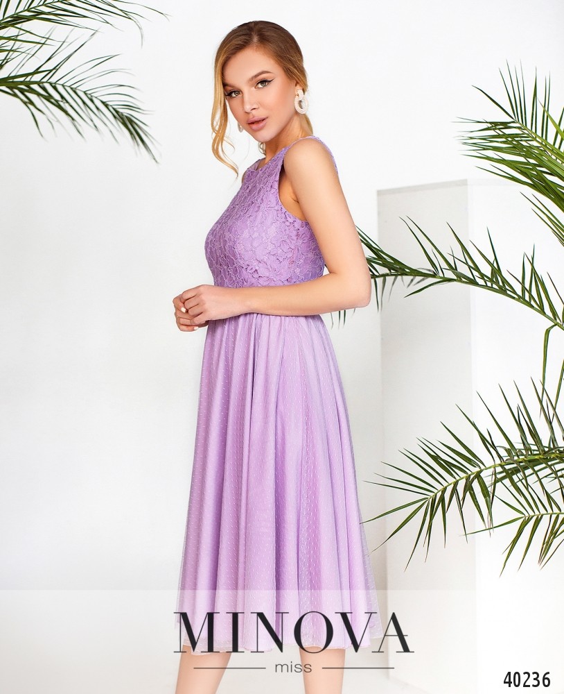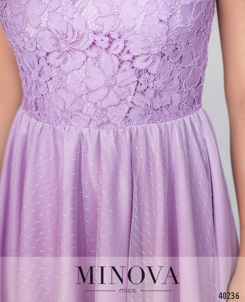 Нарядное и яркое платье с лифом, украшенным гипюром, и нежным двухслойным подолом. Карманов нет, застёжка - вшитая по спинке молния. Вырез горловины полукруглый, неглубокий.