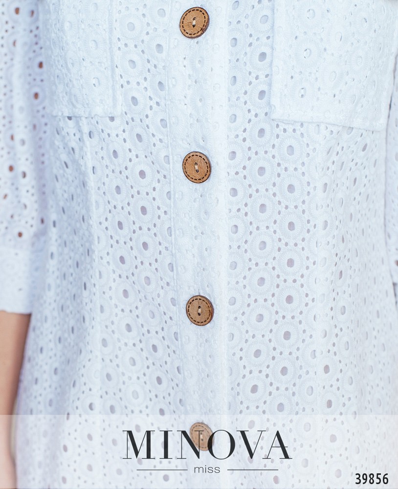 Стильное платье с накладными карманами на груди. Застёгивается на ряд пуговиц спереди на планке, воротничок отложной, рукава с манжетами, без пуговиц. Платье с ажурным верхним слоем и с мягким нижним, подшитым к верхнему.