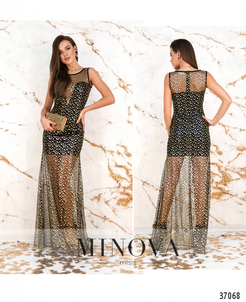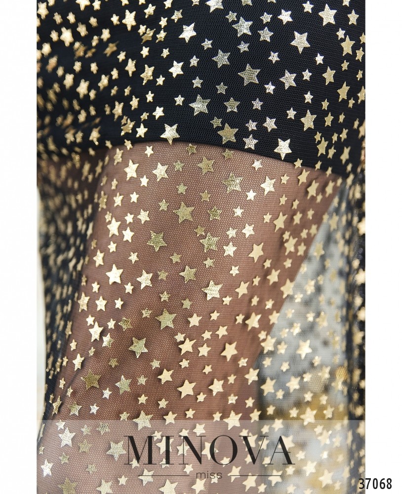 Платье макси с подкладкой мини. Приталенный силуэт, мягкая подкладка. Сверху полупрозрачная сеточка с золотистыми звёздами. Подол немного расклешён. Вырез горловины полукруглый, рукавов и карманов нет. Застёгивается на потайную молнию по спине. Горловина и вырезы рукавов уплотнены тканью.