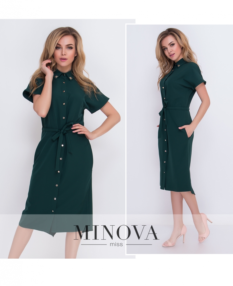 Платье-рубашка на пуговицах с поясом и короткими рукавами. Отложной воротник украшен золотистыми деталями, подол дополнен карманами. Регулируемый пояс вшит в платье. На спинке подол идет на хлест.