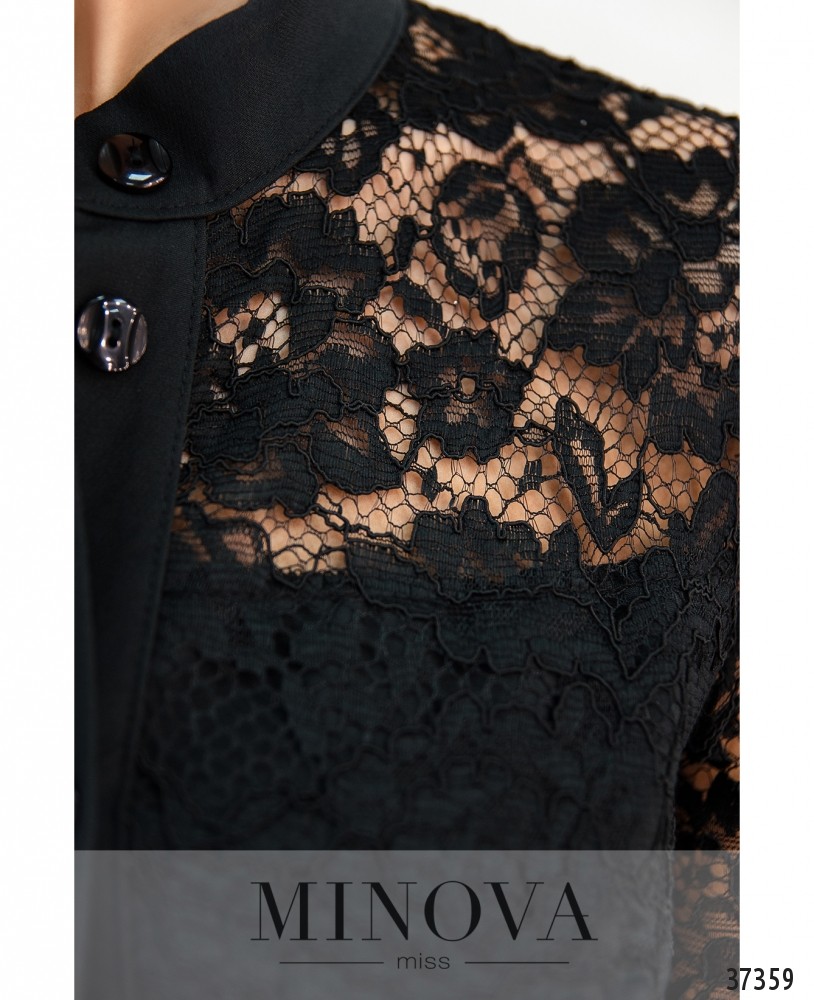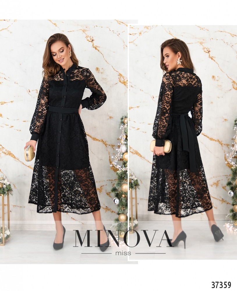 Нарядное праздничное платье приталенного силуэта с расклешённым подолом. Снизу более короткая мягкая подкладка, сверху – кружево. Рукава и плечи без подкладки, на рукавах мягкие манжеты с двумя пуговицами. Воротник – небольшая стоечка, спереди по центру до низа подола – планка с пуговицами. Карманов нет. В комплекте пояс. На груди вытачки. Пояс/аксессуар входит в комплект.