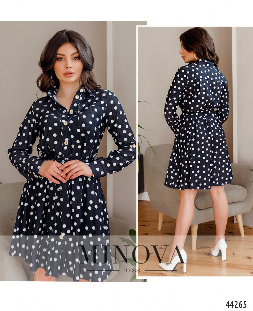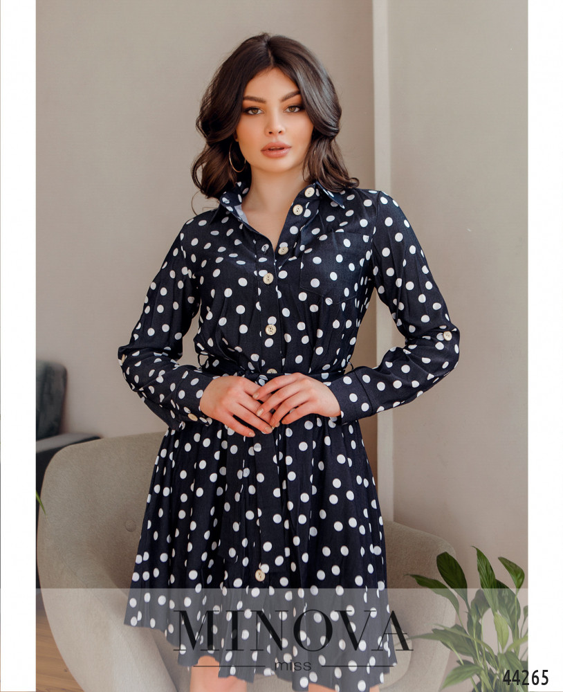 Элегантное платье с поясом, для него - шлейки по бокам на талии. Воротничок отложной, платье застёгивается на ряд пуговиц спереди на планке во всю длину, от воротничка до низу. Подол отрезной, ткань на талии присобрана и ниспадает оборками. Рукава с манжетами, на манжетах по одной пуговке. На груди на левой стороне - накладной карман, по бокам - карманы в шве.