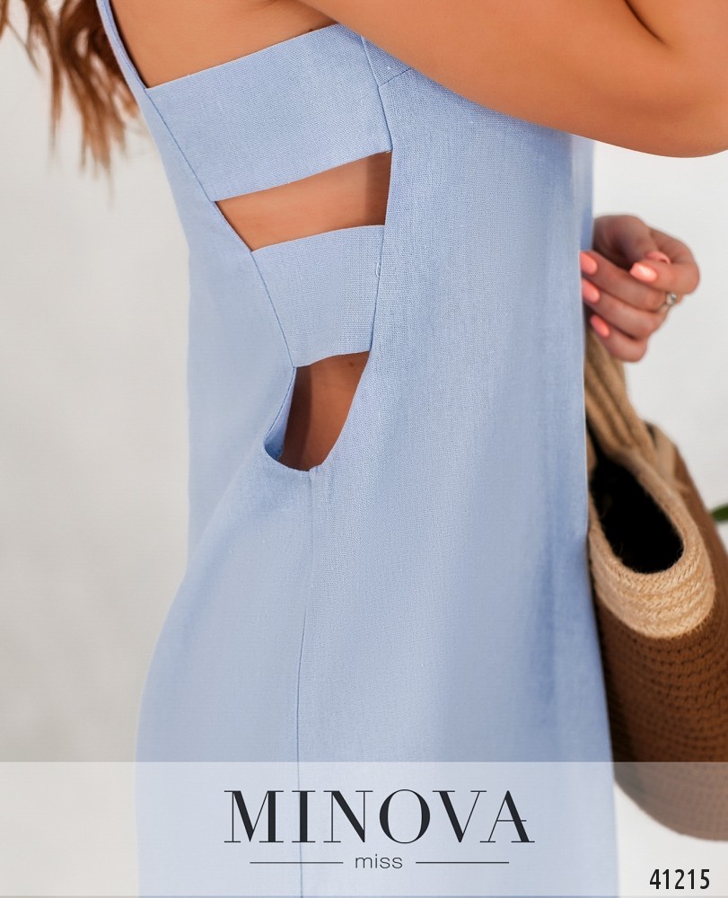 Элегантное платье с разрезами по бокам, украшенными поперечными широкими лентами. Вырез горловины спереди полукруглый, по спинке U-образный. По бокам подола - разрезы, застёжка - вшитая по спинке молния, карманов нет.