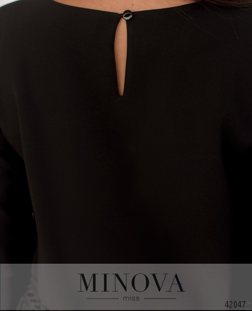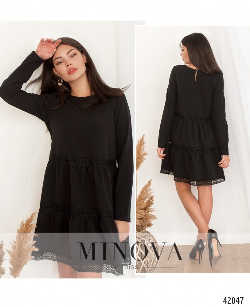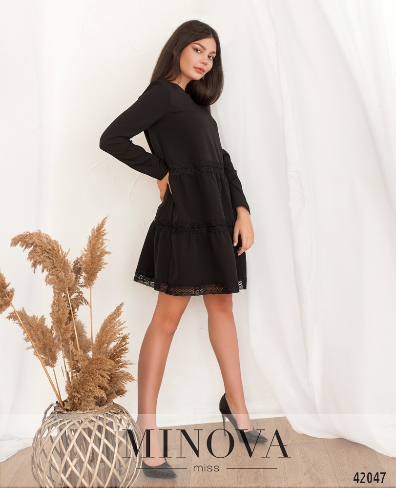 Стильное платье на трикотажной подкладке, по спинке застёжка-капелька на пуговице. Украшено кружевными вставками на подоле. Вырез горловины полукруглый. Рукава без манжет. Карманов нет.