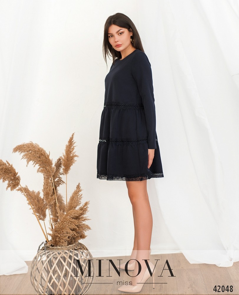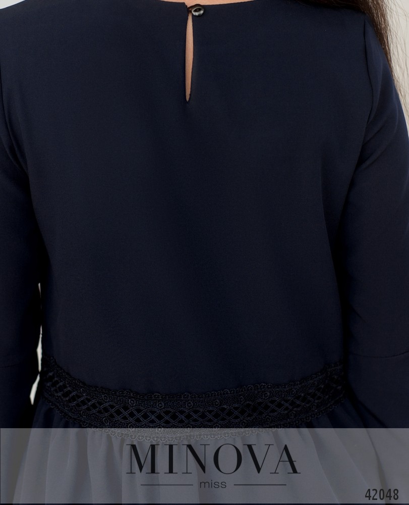Стильное платье на трикотажной подкладке, по спинке застёжка-капелька на пуговице. Украшено кружевными вставками на подоле. Вырез горловины полукруглый. Рукава без манжет. Карманов нет.