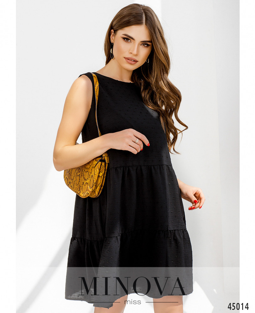 Элегантное платье без рукавов, на удобных широких лямках. Подол подшит несколькими рядами оборок. Застёжка - пуговка сзади под шеей, карманов нет.