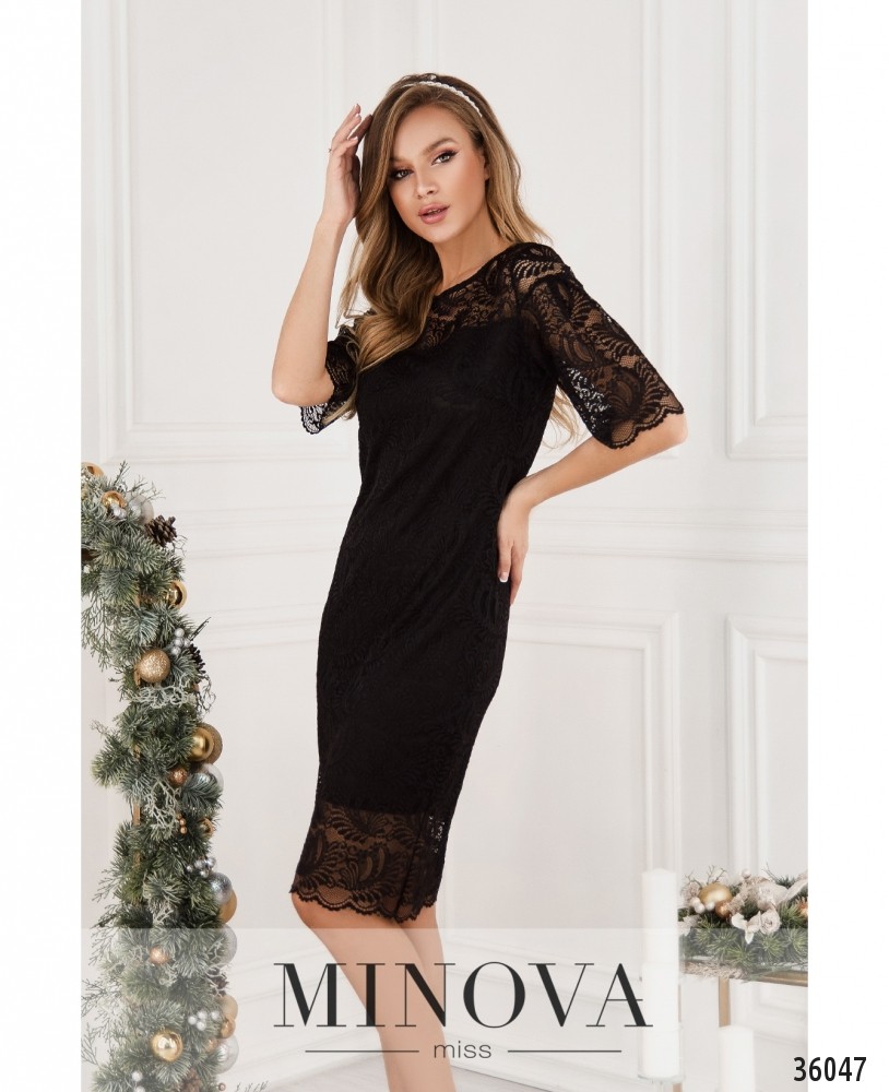 Нежное гипюровое платье из нового каталога Minova – приталенное, довольно длинное, с короткими рукавами. Пригодится и для праздника, и для создания праздничного настроения в будний день. Платье двуслойное: снизу подкладка, которая не просвечивает, а рукава и верх лифа в районе плеч – без подкладки. Карманов нет, на груди – небольшие вытачки. Застёжка – вшитая по спинке змейка. Платье стоит дополнить интересными однотонными или блестящими аксессуарами.