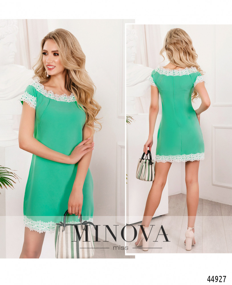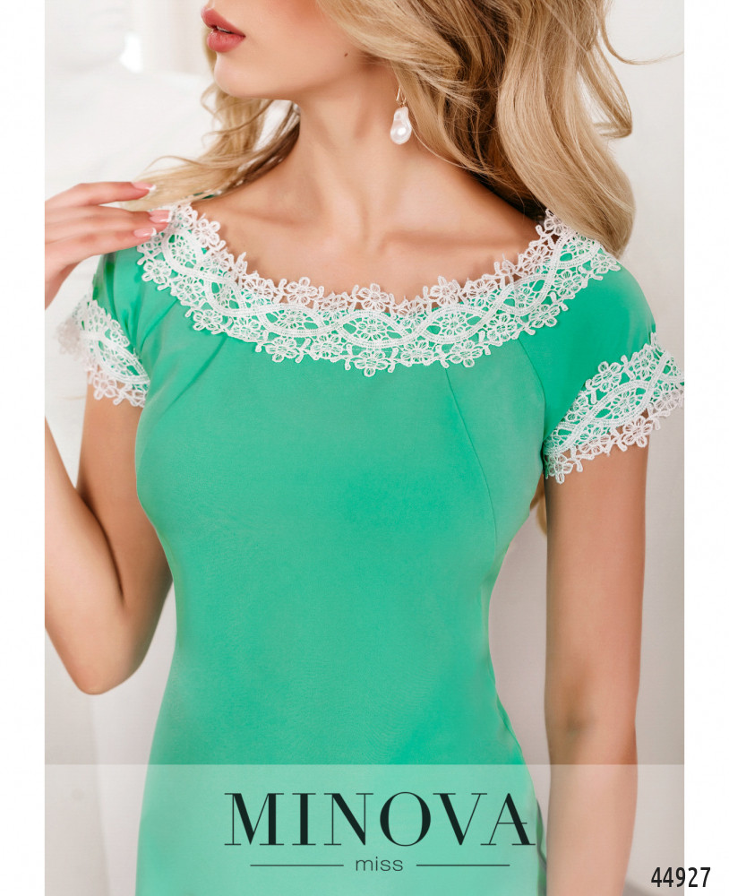 Нежное платье с вырезом горловины "лодочка". Карманов нет, застёжка - молния, вшитая по спинке. Вырез горловины, проймы и подол украшены ажурным кружевом. На талии сзади продольные вытачки. От выреза горловины до талии спереди - диагональные вытачки.