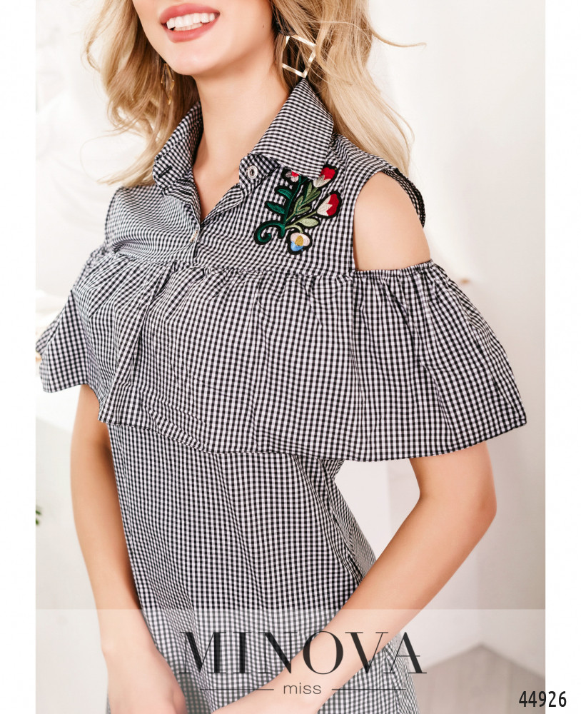Стильное платье с отложным воротничком и двумя пуговками, на лифе - оборки, на плече вышивка. Рукава-оборки, со вшитыми резинками, плечо открыто. Карманов нет.