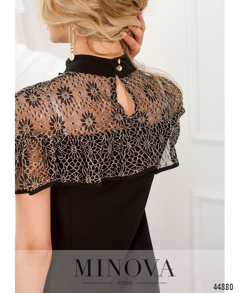 Нежное платье приталенного силуэта, на спине продольные вытачки. Воротник-стоечка с бантом. Рукавов нет, плечи покрывает подшитая накидка из ажурного гипюра. Карманов нет. Застёжка - пуговка сзади под шеей.