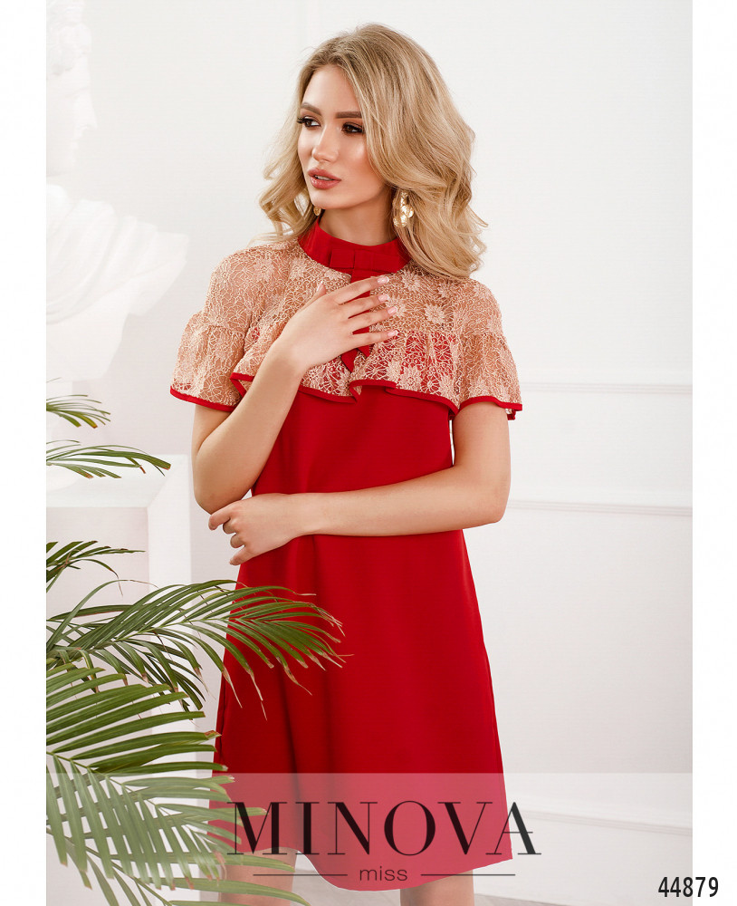Нежное платье приталенного силуэта, на спине продольные вытачки. Воротник-стоечка с бантом. Рукавов нет, плечи покрывает подшитая накидка из ажурного гипюра. Карманов нет. Застёжка - пуговка сзади под шеей.
