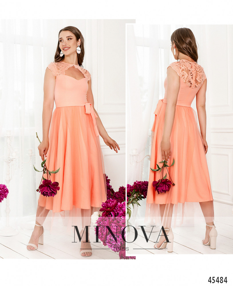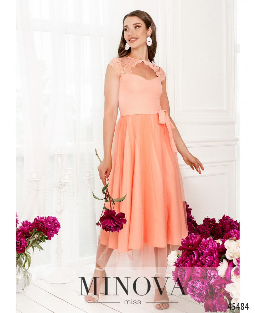 Яркое вечернее платье миди с кружевными вставками на лифе позволит вам почувствовать себя настоящей принцессой. Верхняя часть с женственным декольте застегивается на невидимую змейку по спинке и плавно переходит в воздушный расклешенный подол с фатиновым верхним слоем. Завершите образ с помощью текстильного пояса на талии и дополните его туфельками или босоножками.