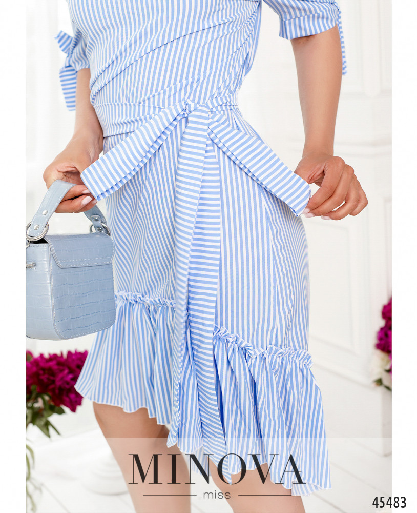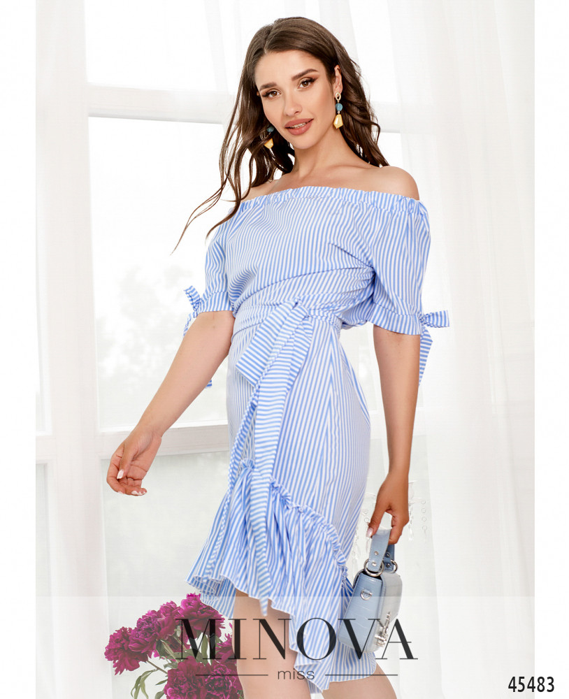 Женственное платье в полоску из легкой натуральной ткани станет ярким дополнением вашего летнего гардероба. Игривые манжеты с завязками и воздушная оборка, пришитая к подолу, помогут создать кокетливый образ в романтическом стиле. А резинка, вшитая в вырез горловины, позволит приоткрыть линию плеч.